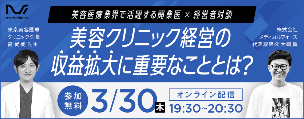 【無料ウェビナー開催のお知らせ】 3/30(木)19:30~ | 美容クリニック経営の収益拡大に重要なこととは? 〜美容医療業界で活躍する開業医×経営者対談
