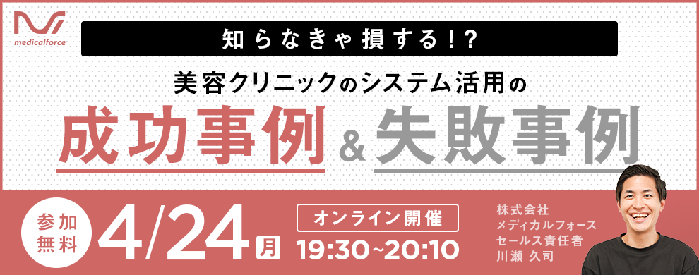 【無料ウェビナー開催のお知らせ】 4/24(月)19:30~ | 美容クリニックのシステム活用の成功事例&失敗事例