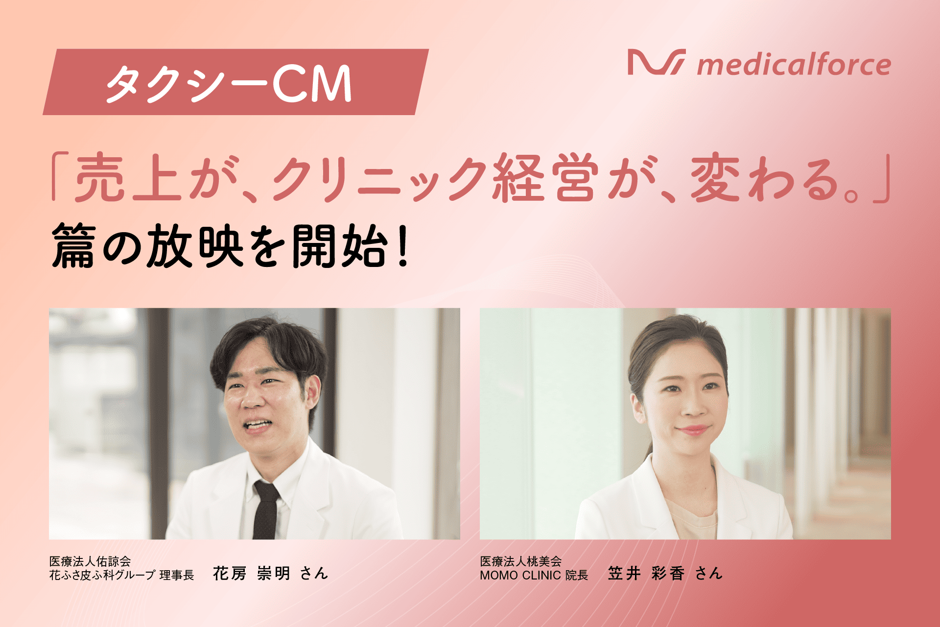 本CMでは、「売上が、クリニック経営が、変わる。」というメッセージを軸に、medicalforceがクリニック現場にもたらす変化を、実際に導入されている医師のリアルな声を通じて描いています。出演いただいた花ふさ皮ふ科グループ様、MOMO CLINIC様は、それぞれ異なる診療スタイル・運営形態の中で、medicalforceの操作性やサポート体制、予約管理や経営管理機能、保険・自費の一元管理による業務効率化を実感されています。