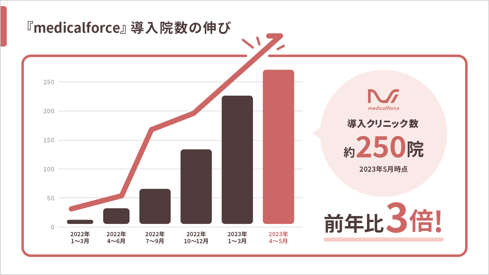 これは、サービスのローンチから2年2か月での達成となり、高い水準での成長を実現しております。自由診療クリニックにとってスタンダードなSaaSになりつつある中で、引き続きプロダクトサービスの利便性の追求、お客様サポート体制の強化、UI/UXのさらなる改善を実施し、「medicalforce」を通して、自由診療クリニックの現場のみなさま⼀⼈⼀⼈の⽇々の業務のDXと、患者さまの体験の向上の実現に貢献してまいります。
